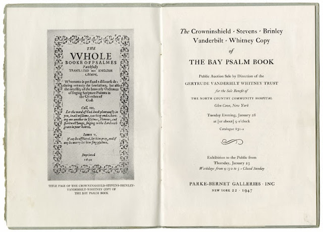 The forthcoming sale of the Bay Psalm Book will be an event long remembered in the world of rare books, just as its 1947 sale showed what can happen when a book that has an attraction to those who aren’t bibliophiles is sold at a public auction. In the 1947 auction, competition from a non-collector, Cornelius Vanderbilt Whitney, pushed the sale price to the unexpected level of $151,000. The volume was purchased by The Rosenbach Company on behalf of Yale University, but the hammer price far exceeded the commission bid that Yale and its benefactors had given Rosenbach, and in the complications surrounding the aftermath of the sale, the Bay Psalm Book made its way to Yale only after a sizeable contribution on the part of The Rosenbach Company.